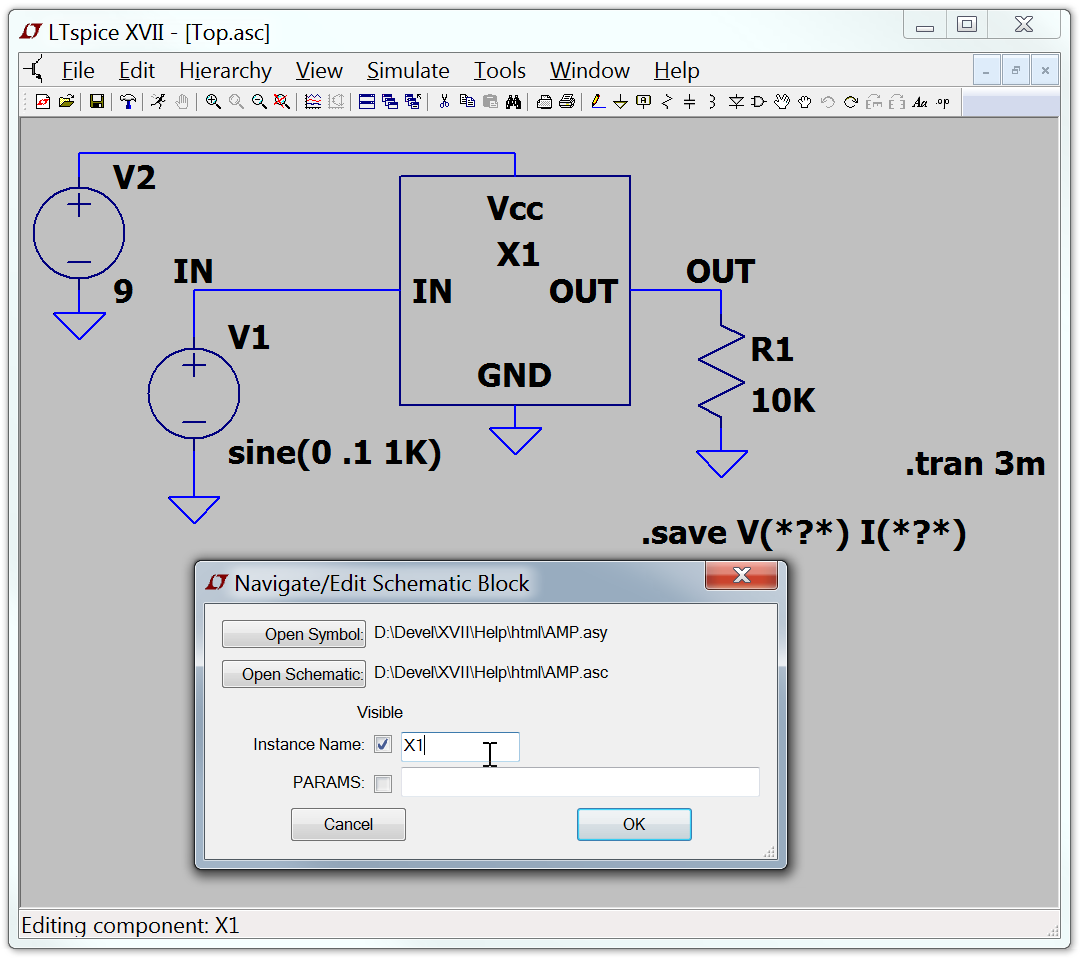 Note that this dialog also allows you to enter parameters to pass to this instance of the circuitry in preamp.asc.
