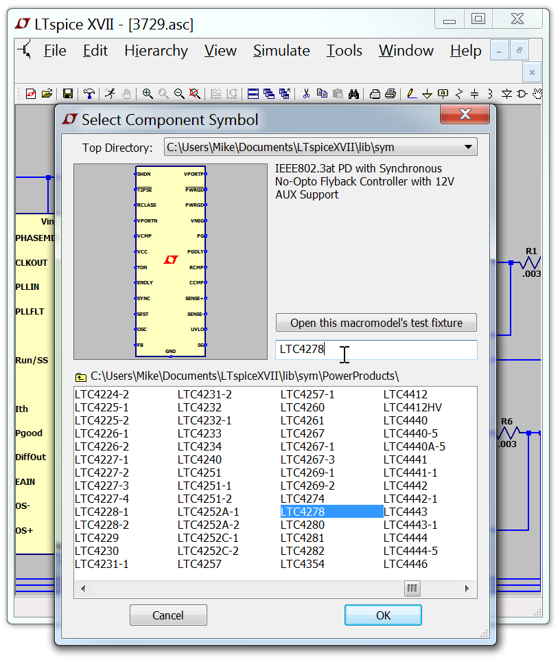 There is a button to open the test fixture for the Linear Technology models.
