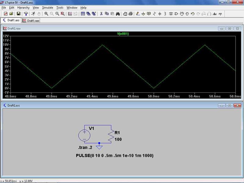 Screenshot of LTspice using a Pulse of an independent voltage source to create a triangle wave.